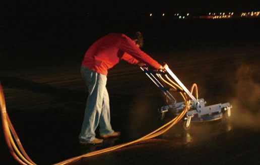 機場跑道因飛機起落,輪子與道面的急劇摩擦使橡膠粘在道面上,久而久之,粗糙的道面就變得很光滑,這樣飛機就容易滑出跑道。定期除膠保證道面摩擦系數大于0.5,所采用的就是超高壓水射流技術,其基本要求就是既要除去橡膠,又要不傷跑道。以往采用人工刷洗和化學清洗的方法,但效果并不理想成本高、易污染,不適應瀝青道面等缺點。國內外機場都在普遍應用水射流進行除膠作業。漢諾所提供的高壓泵機組配合清洗手推車可以高效地解決以上問題。