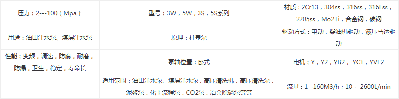 適用范圍: 油田及礦場注水泵、超高壓泵、噴射泵,除鱗泵、高壓清洗泵,加濕泵,噴霧泵,流程泵、稠漿泵、泥漿泵、液態(tài)二氧化碳泵、洗滌劑料漿泵、化工泵、液壓泵、輸油泵,海水泵等專業(yè)用泵。 特 點: 該泵吸收國內(nèi)泵業(yè)之精華,設計先進、結(jié)構(gòu)緊湊、體積小、泵效高、運行平穩(wěn)、安全可靠、操作簡便、產(chǎn)品制作精良、外形美觀。每個品種的泵都有安全調(diào)壓閥,泵壓可以任意調(diào)節(jié),并有油溫、壓力、自動保護。 結(jié)構(gòu)型式:固定式、移動式 泵體結(jié)構(gòu):臥式、立式 傳動型式:電機或柴油機,變速型式:皮帶、齒輪、電磁調(diào)速、變頻速、 主要零部件:機座(材料HT250);泵體(材料:316、1Cr18Ni9Ti、2Cr13、 碳鋼化鍍鎳-磷合金防腐層)經(jīng)熱處理,避免疲勞破裂;曲軸(材料:35CrMo、42CrMo)經(jīng)調(diào)質(zhì)硬氮化處理、強度大、硬度高、耐磨耐用;柱塞(材料:超性陶瓷、噴焊鎳合金Ni60耐磨耐腐層);盤根密封(采用進口芳綸或碳素纖維)。 閥組型式:錐閥、平板閥、組合閥等。經(jīng)特殊處理,耐磨耐用。